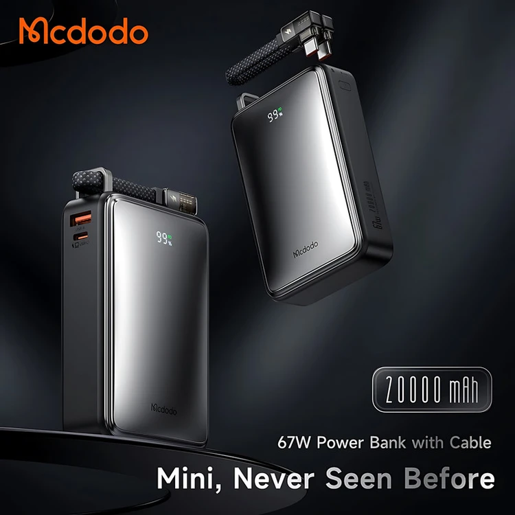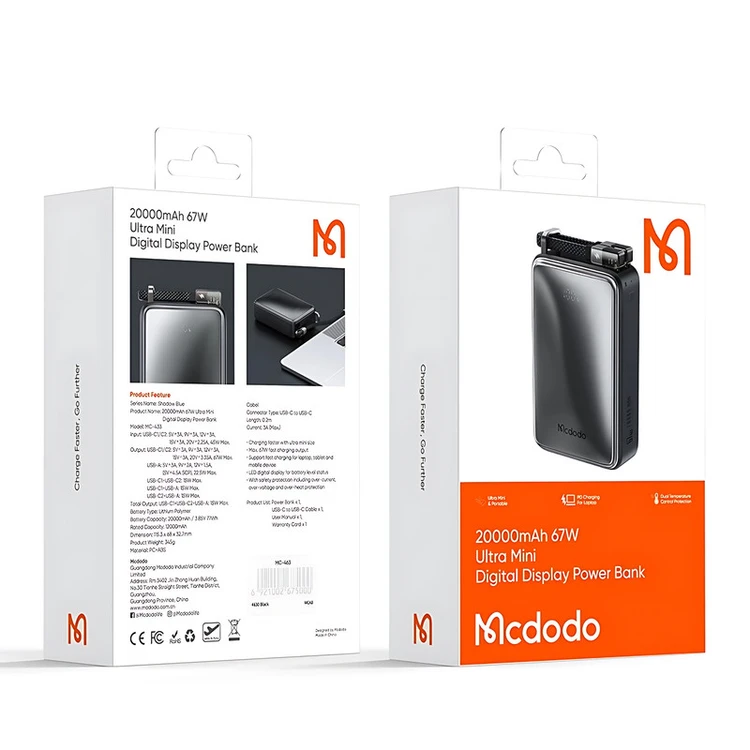 پاوربانک Mcdodo مدل MC-433 ظرفیت ۲۰۰۰۰ mAh با طراحی Ultra Mini و ساختار فشرده، توانسته حجم بسیار کمتری نسبت به ظرفیت مشابه داشته باشد. درک مدارهای داخلی با ساختار نوآورانه باعث شده که این پاوربانک همزمان حجم کم و خروجی بالا ارائه دهد. بدنه آن از جنس مقاوم و با کیفیت ساخته شده که دوام بالایی در برابر استفاده مداوم دارد. طراحی گِرد و ارگونومیک، حمل راحت در کیف، جیب یا مکانی پر رفت و آمد را ممکن میسازد. علاوه بر آن، نمایشگر دیجیتال LED روی دستگاه وجود دارد که میزان شارژ باقیمانده را با عدد دقیق نمایش میدهد و کاربر را از وضعیت پاوربانک همیشه آگاه نگه میدارد.